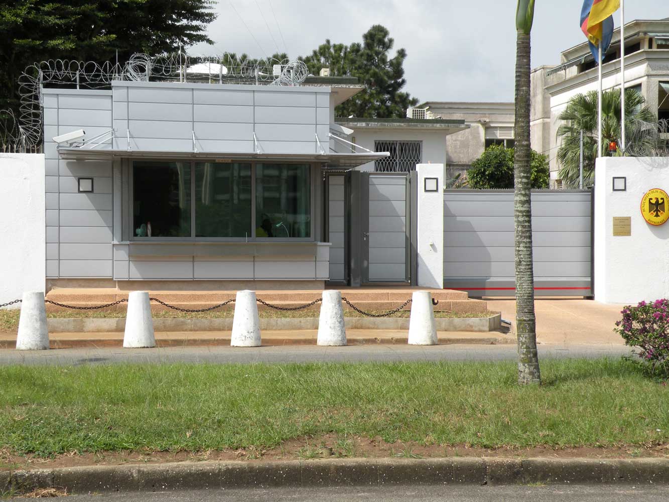 Sicherungsmaßnahmen an der Deutschen Botschaft in Abidjan, Cote d´Ivoire: Sicherungsmaßnahmen am Botschaftsgebäude und an der Überwachungszentrale, schusssichere Fenster und Türen, Personenschleuse mit Personenkontrolle, Widerstand der Einfriedung gegen Anprall von Fahrzeugen und gegen Sprengstoffanschläge, Videoüberwachung, Sicherungsmaßnahmen im Gebäudeinneren in Verbindung mit Brandschutzmaßnahmen. |